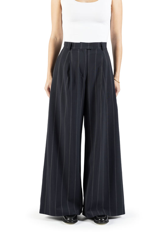 Pantalone dritto con piega stirata in lana trama blu e bianco