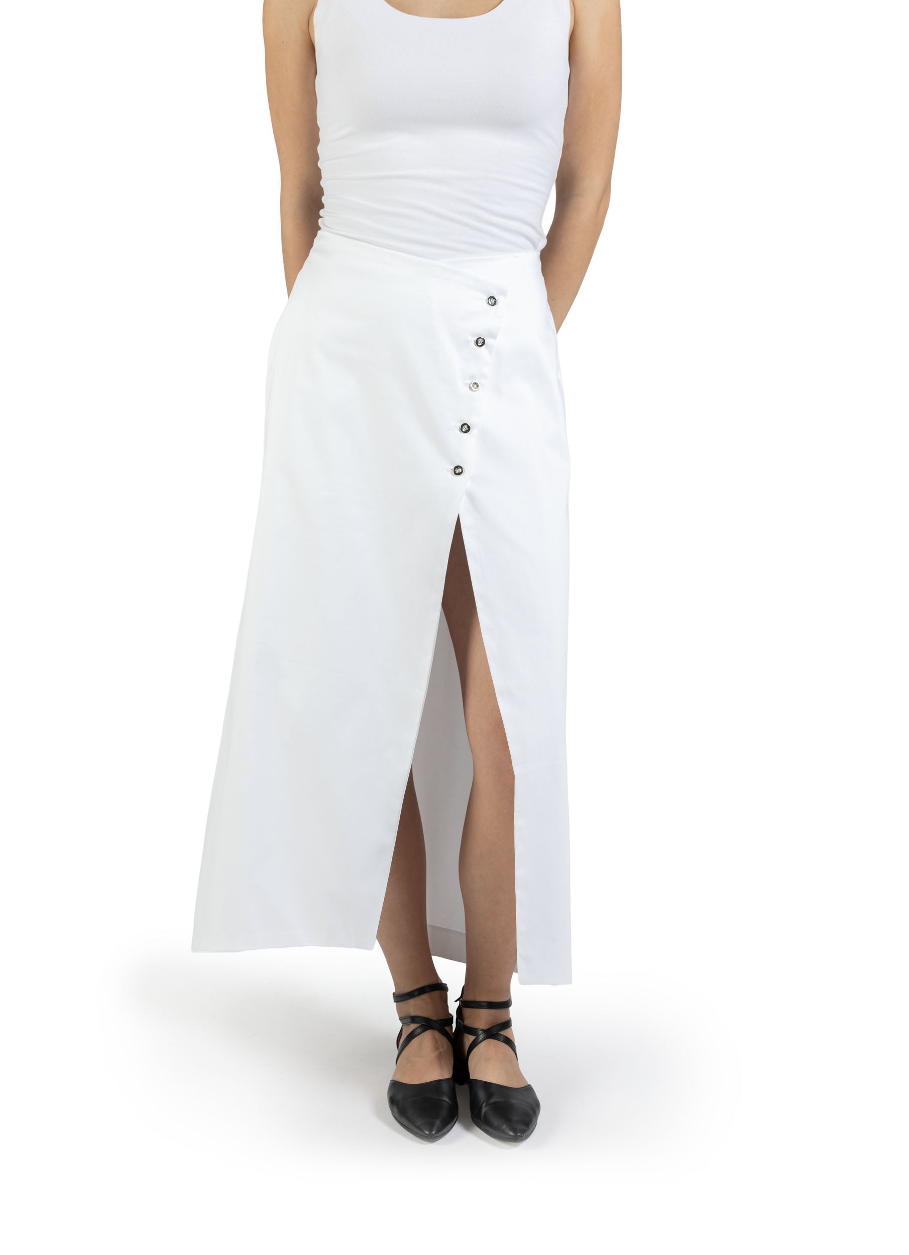 Confortevole, raffinata e super chic, questa gonna a portafoglio in bianco ottico non può assolutamente mancare nel tuo guardaroba. Realizzata in cotone ed elastan, il capo presenta una chiusura anteriore asimmetrica; la forma a punta della vita sublima la silhouette femminile. Di lunghezza midi, questo capo si presta ad ogni occasione.